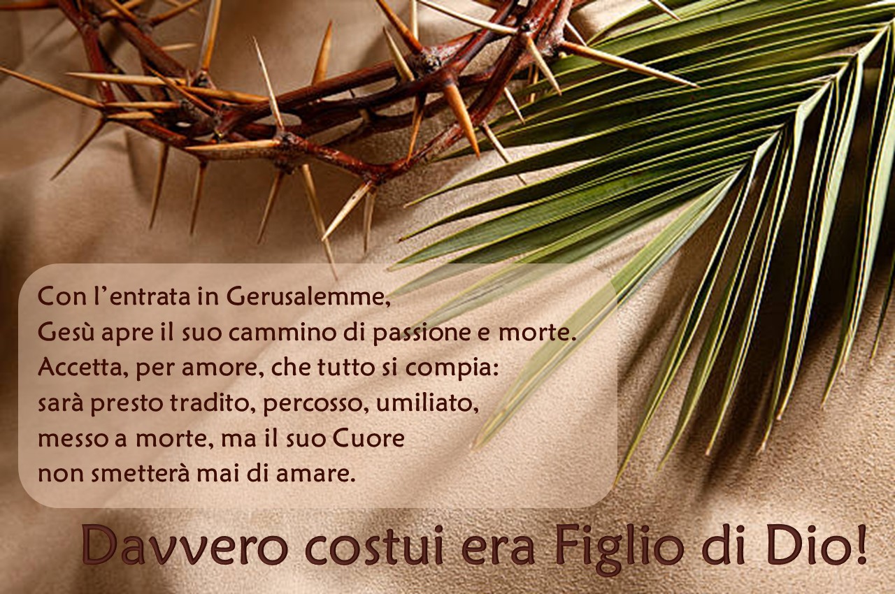I discepoli andarono e fecero quello che aveva ordinato loro Gesù: condussero l’asina e il puledro, misero su di essi i mantelli ed egli vi si pose a sedere. La folla, numerosissima, stese i propri mantelli sulla strada, mentre altri tagliavano rami dagli alberi e li stendevano sulla strada. La folla che lo precedeva e quella che lo seguiva, gridava: